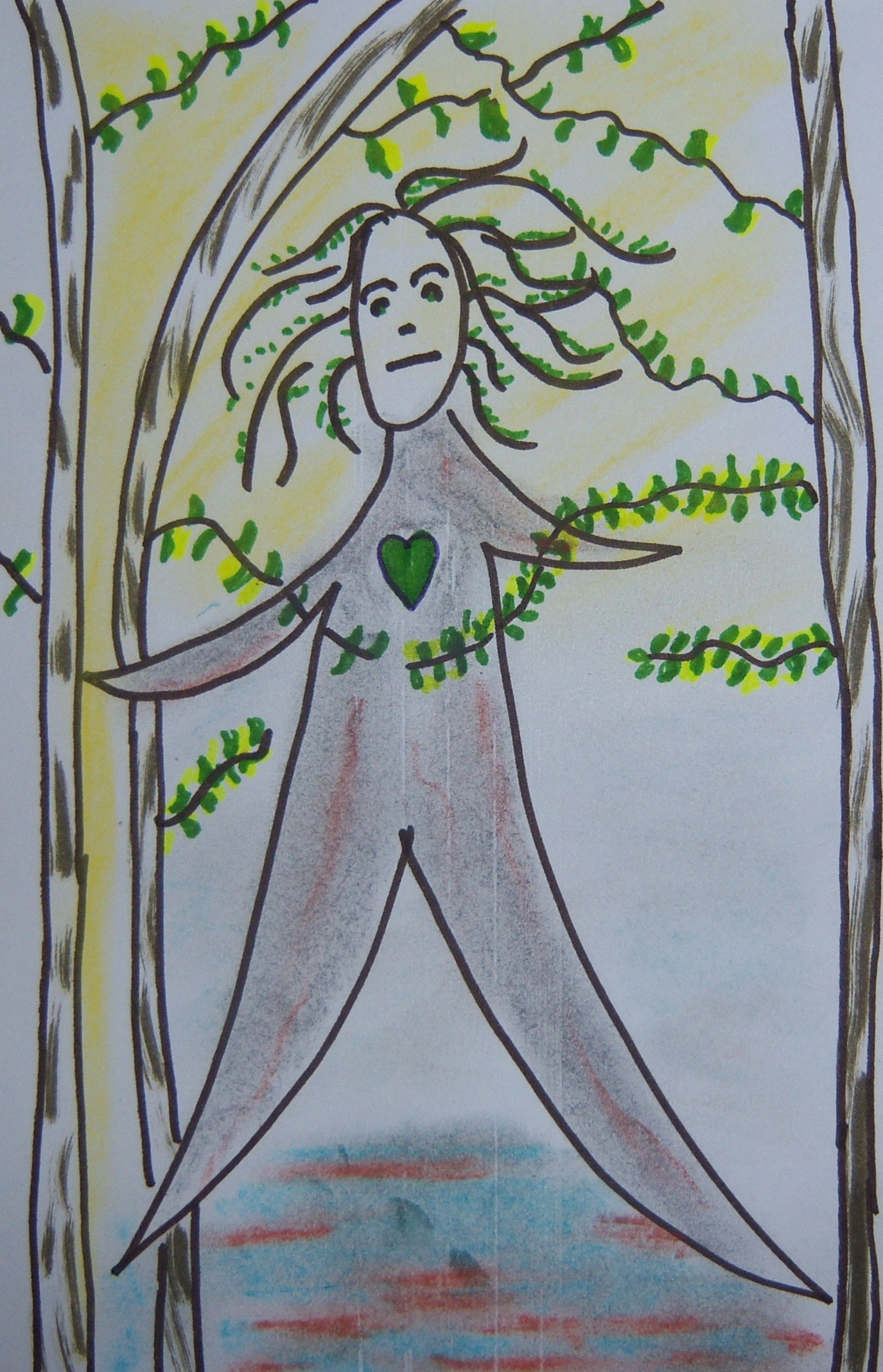 Then, a new feeling emerges…desire. To be cared for, embraced. My body moves to this feeling and I dance over to the birch trees. Green leaves surround me, embrace me, pull me in. Suddenly I am dancing with the trees. I look up and see a sky of green leaves above me.