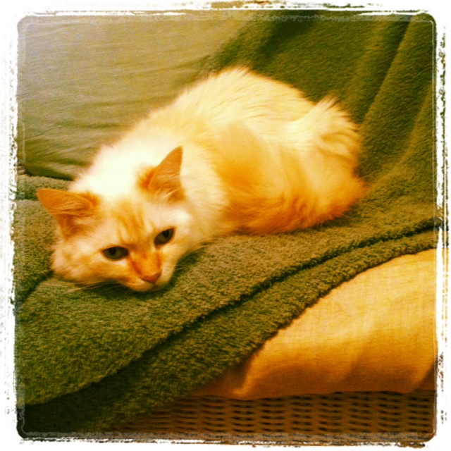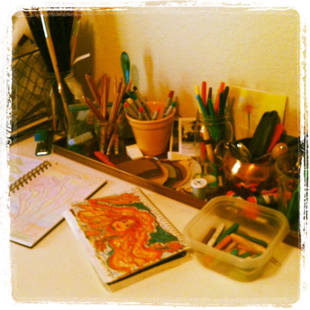 But there’s another expanse of flat workspace to the right of the computer that’s relatively feline-free, and it’s good for art journaling and whatnot. A bunch of renegade art supplies have found their way there too: pastels, paint brushes, paint pens, markers. And yes, that is a garlic press popping out of the brass container. Who knew it was just the thing for making cool spaghetti-like clusters from clay?
