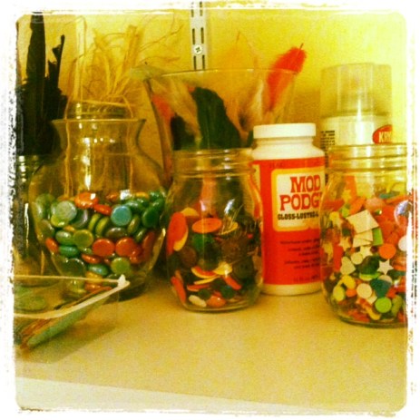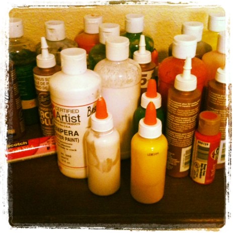 Even though the door-tables never got moved to the center of the room for group art-making, I discovered they’re perfect right where they are. I can store a lot under them, like this cart filled with paper, journals, yarn, ribbon, crayons, ephemera, and stacks of process painting experiments.