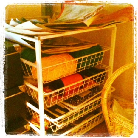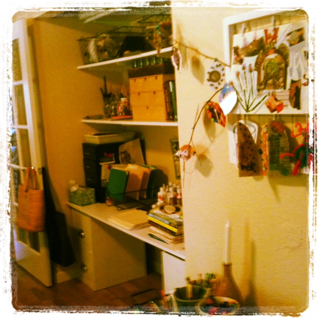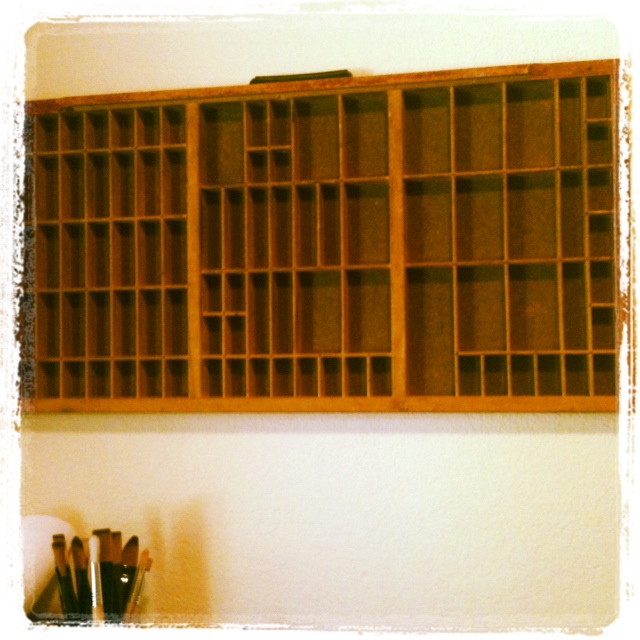 An old printer’s tray hangs above the art materials. Dave spied it at an antique fair and we got it for a steal. Now I’ve appropriated it and one day hope to use it for an interesting mosaic-like fabric collage.
