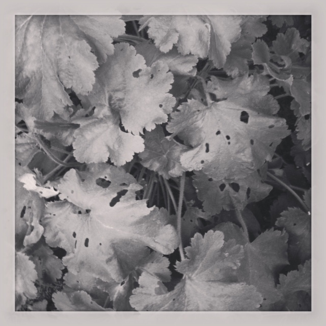 I also kind of like the look of the bell-less coral bells, made holey by the feasting snails.