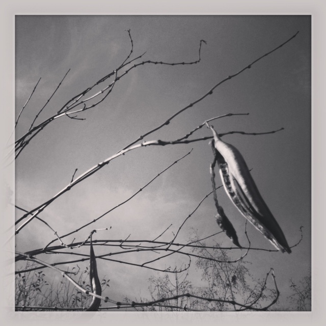 Maybe for the first time I’m taking delight in the lingering trumpet vine branches, bright orange blossoms long gone, forlorn seed pods waving in the wind.