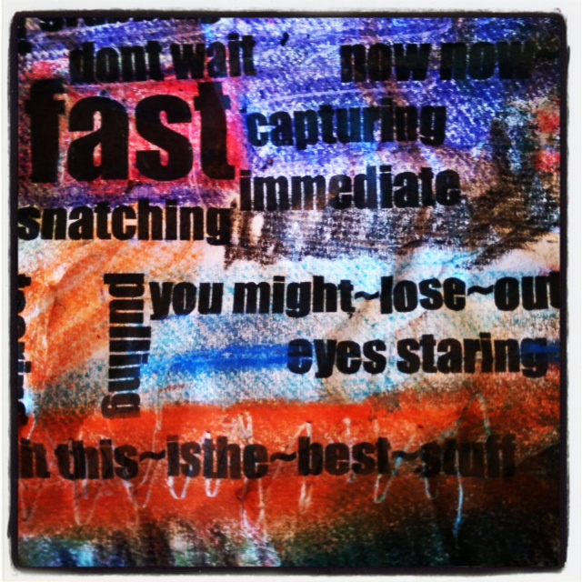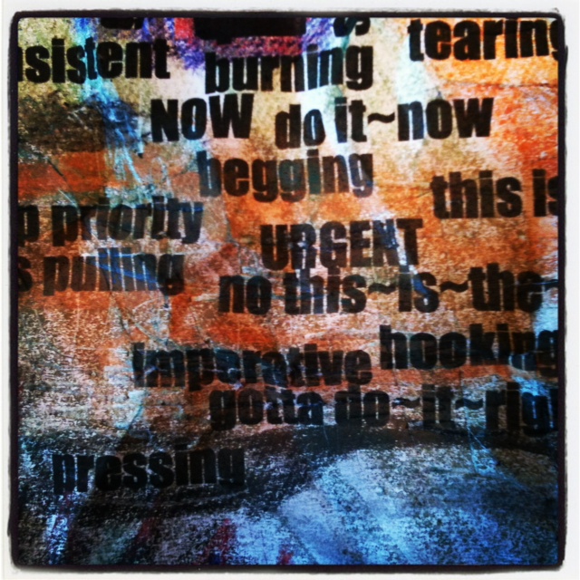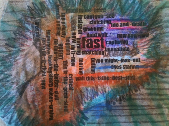 Well, this time I took a deep breath and made a wordle, dumping the churning thoughts and feelings into a free write and printing it out. Then I gleefully had at it with colorful crayons and chalk pastels. As the urgency flowed out through my finger tips and spilled onto the paper I began to breathe easier. When I thought it was done I scraped around on it with scissors. Then crumpled it up. And ripped it to shreds, just for good measure.