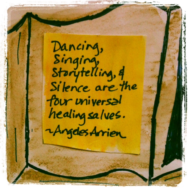 Here’s how it goes: several years ago I was reading a book and came across an interview with Angeles Arrien where she talked about the four healing salves: singing, dancing, storytelling and silence. Her words resonated with me so much and inspired me to write a post about healing.